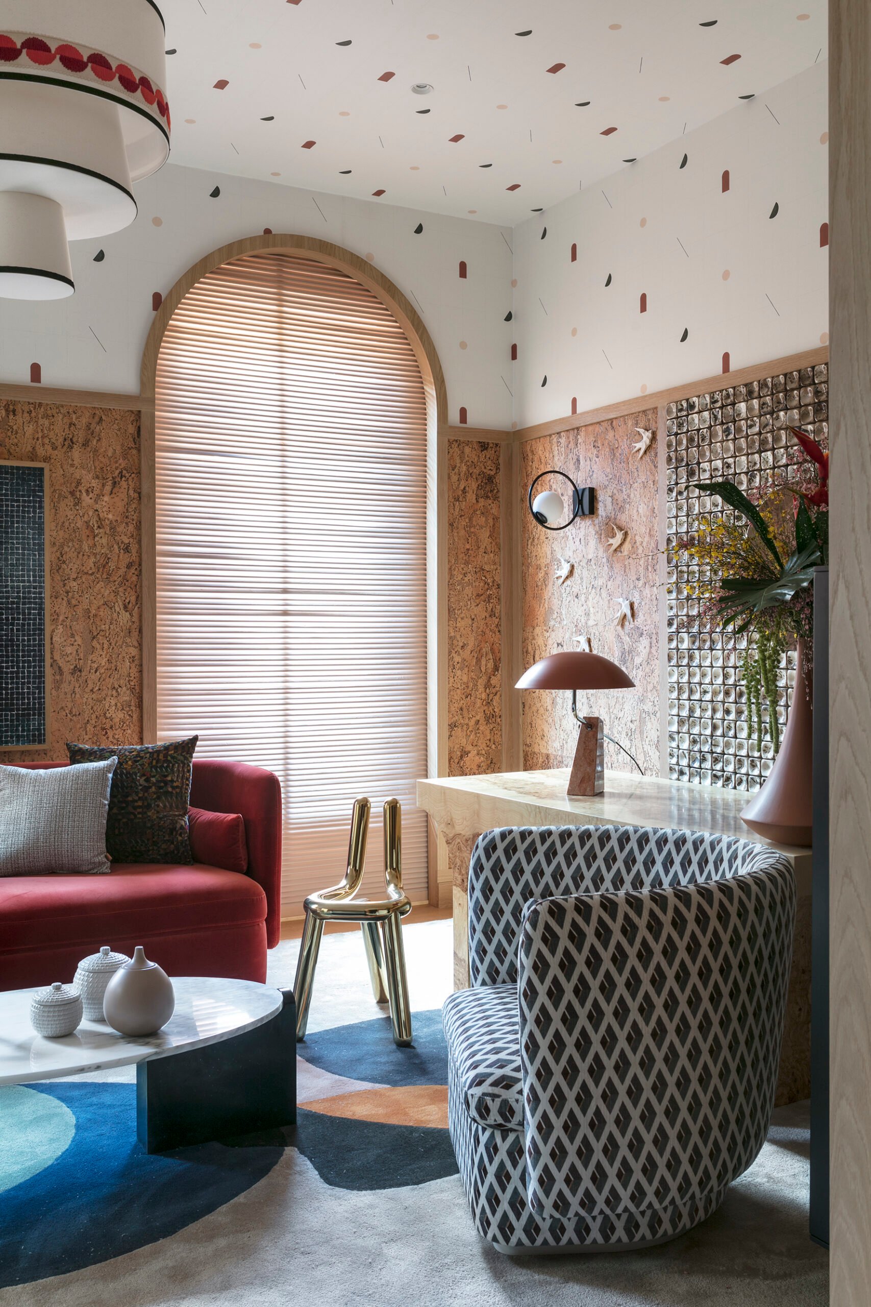 Vimos isso na Casa Decor 2019 no espaço idealizado por Erico Navazo, onde o lambril, feito em grande escala, pois o designer queria que ele correspondesse à altura da janela, criou um movimento e um calor espetaculares.