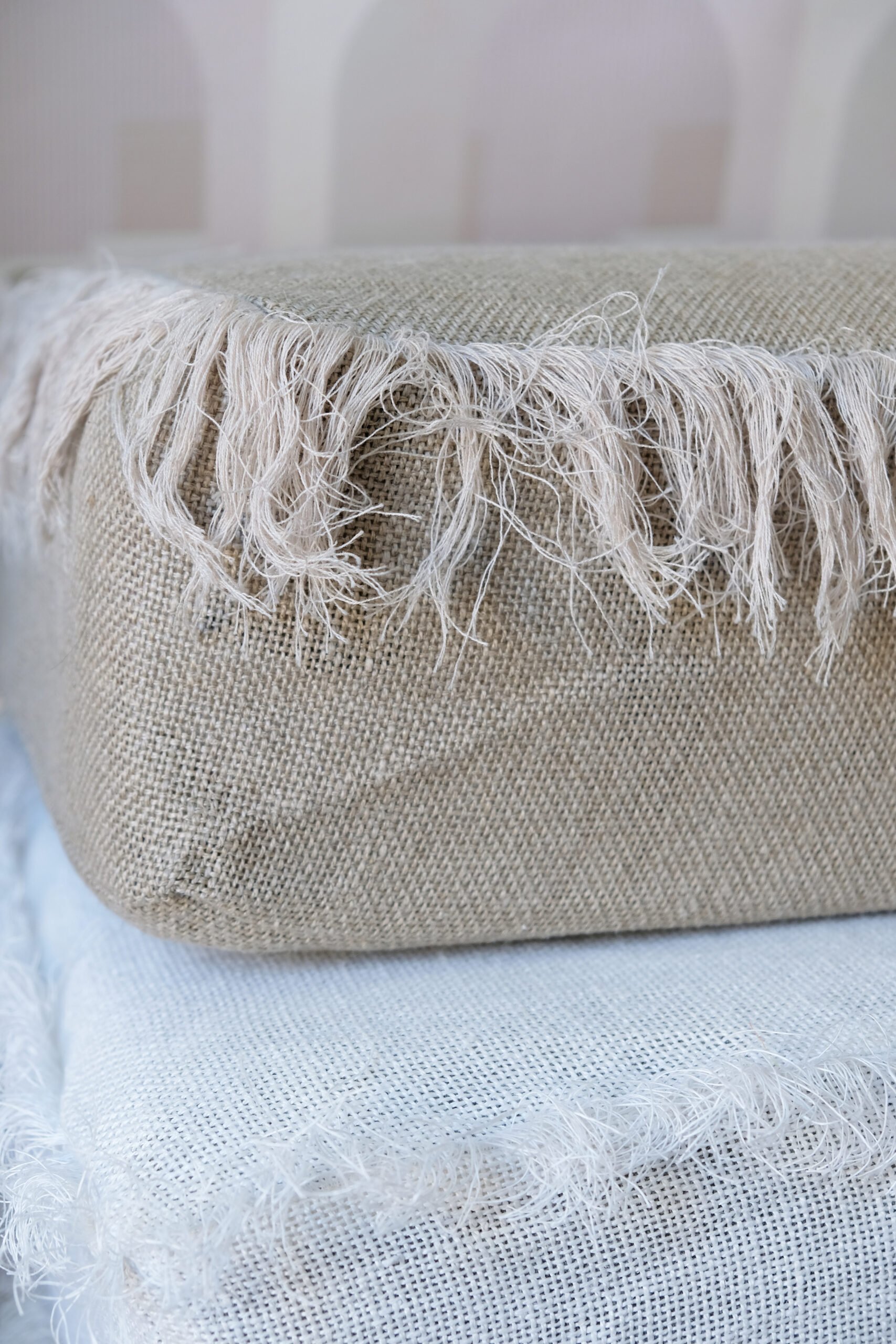 - Nuestra tela Tramuntana de la colección IBIZA. Es la tela perfecta para esta técnica porque tiene un tejido ancho y además es 100% lino orgánico con un aspecto deslavado muy suave. En lugar de utilizar la típica arpillera que te picará hasta la saciedad, y que además te obliga a bordar o forrar toda la tela, Tramuntana te permitirá el lujo de no tener que forrar la tela, debido a su suavidad.