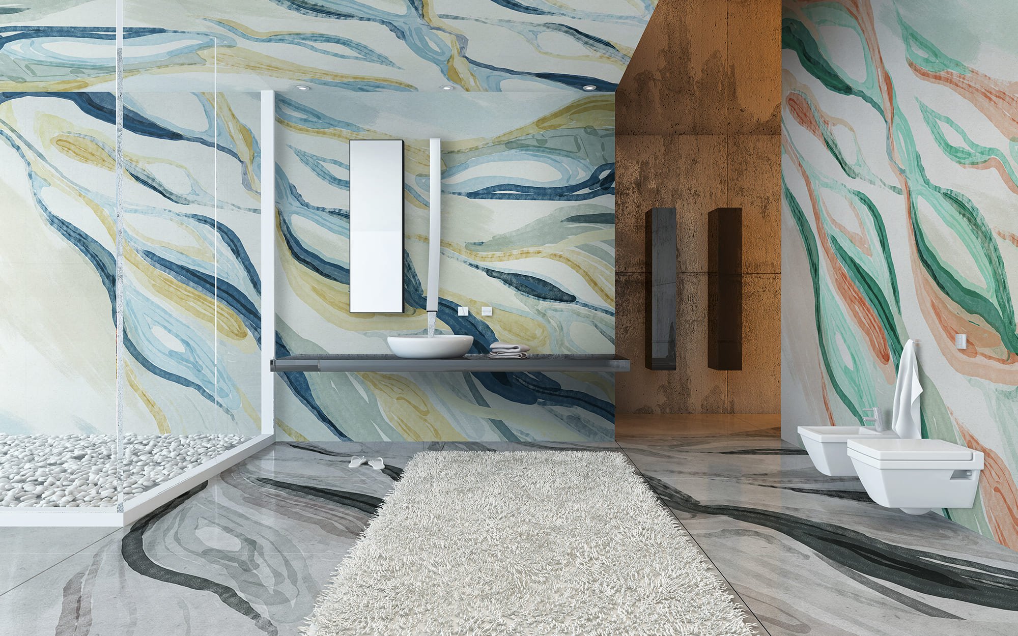 Nous avons absolument tout couvert en papier peint pour vous montrer que le papier peint c'est de l'architecture. Nous voulions également générer l'impact que nous recherchions avec notre design Hygge : tomber dans l'état ultime du plaisir. Nous imaginons un cadre rempli de vapeur, où les vagues grand format de notre design vous enveloppent et vous emmènent dans un état de relaxation.