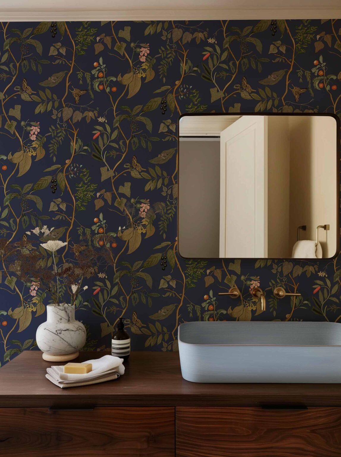 Le papier peint Diderot Topaz de Coordonné est un papier peint végétal dans les tons bleu/marine de la collection Maximalism.